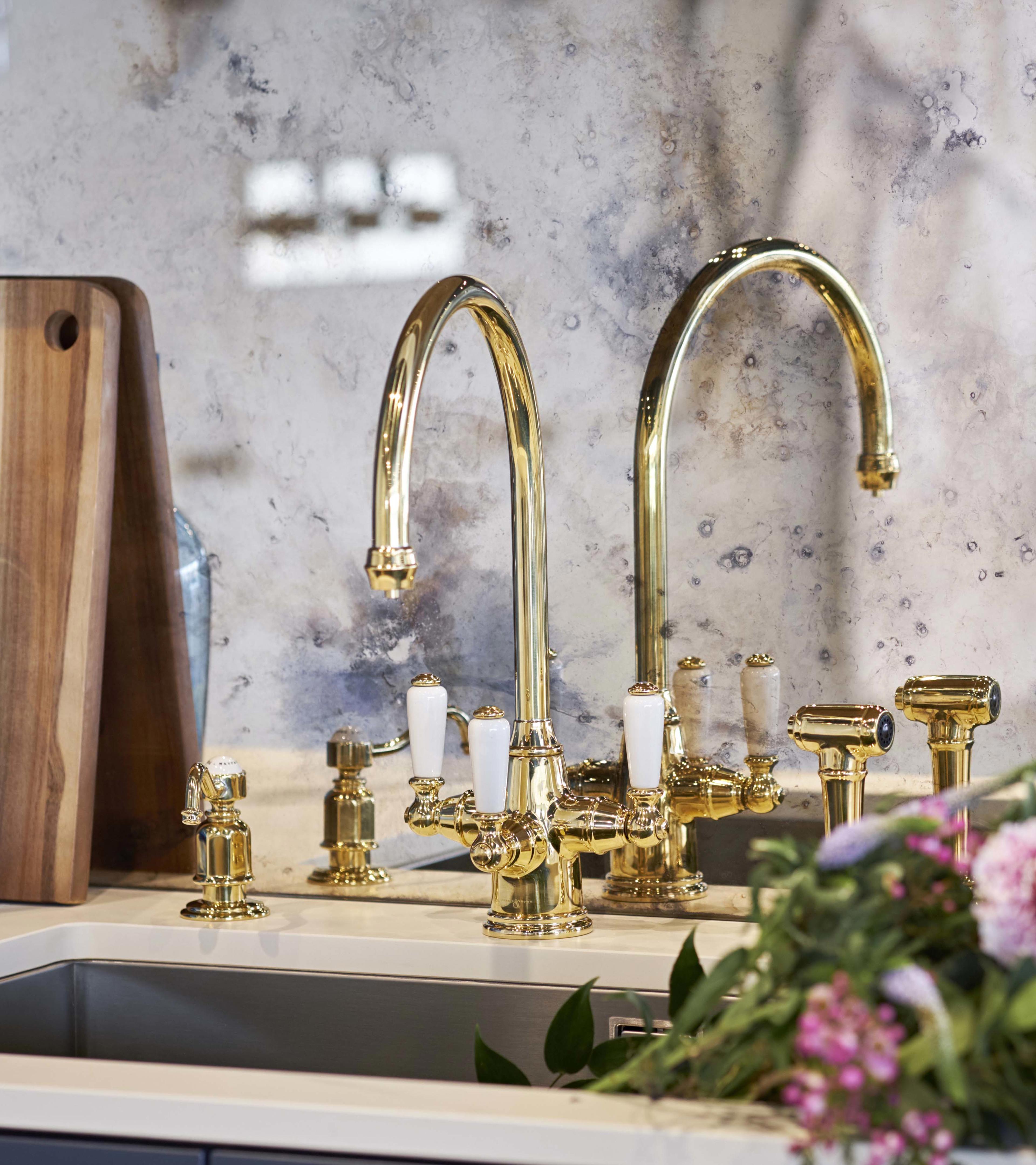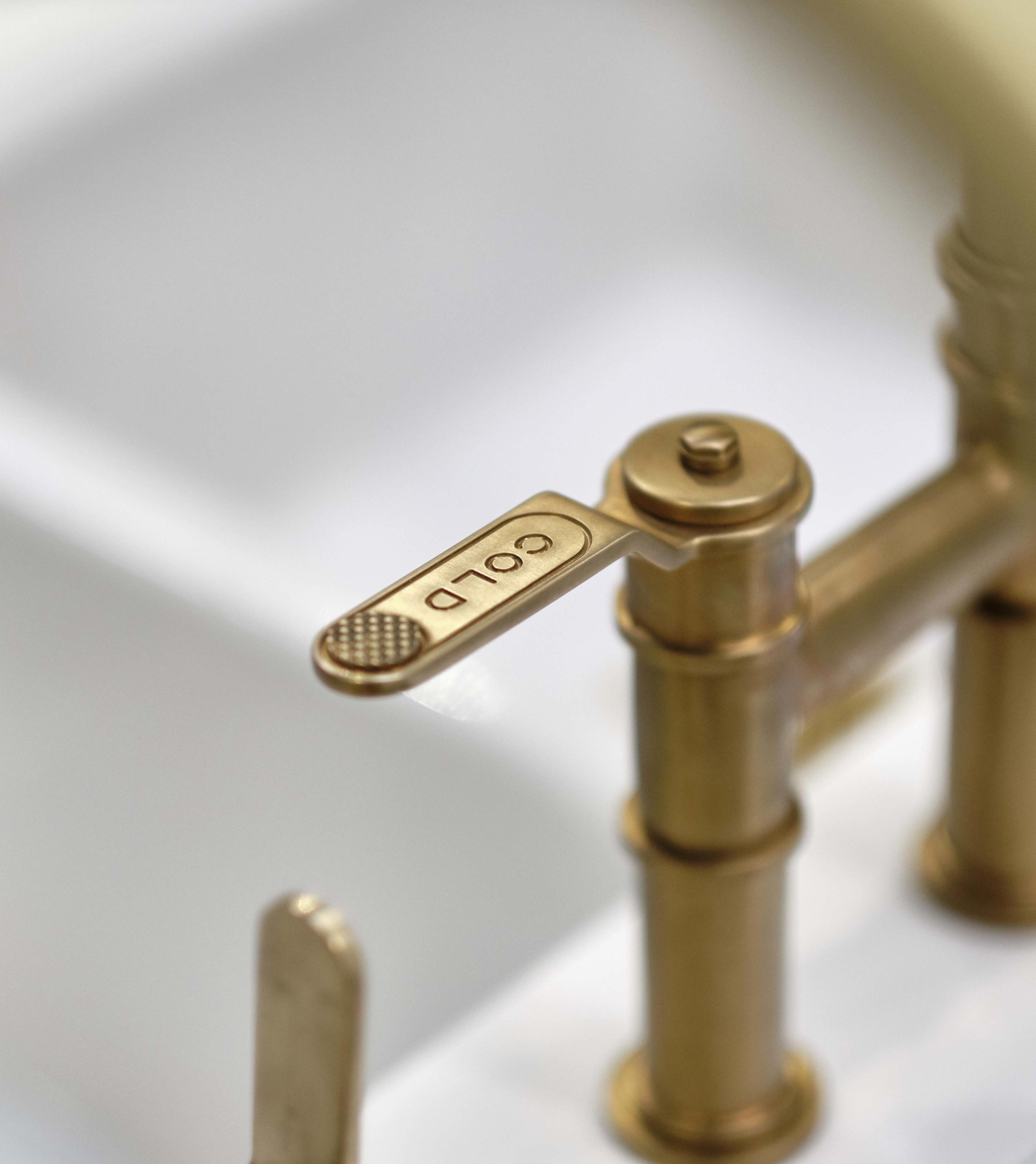 Unsere mit Gold galvanisierten Produkte werden mit echtem 24 Karat Gold beschichtet. Gold ist eine empfindliche Oberfläche. Sie sollte wie ein feines Schmuckstück behandelt und nach dem Gebrauch vorsichtig mit einem feuchten, flusenfreien Tuch gereinigt werden. Diese wunderschöne Ausführung kann je nach Licht unterschiedlich aussehen: manchmal hell und warm, oft weich und elegant. Die traditionell für klassische Armaturen gewählte Gold-Ausführung findet sich mittlerweile auch häufiger in moderneren Designs und kommt dort wunderschön zur Geltung. Ein echter Luxus für jede Armatur in Küche und Bad.