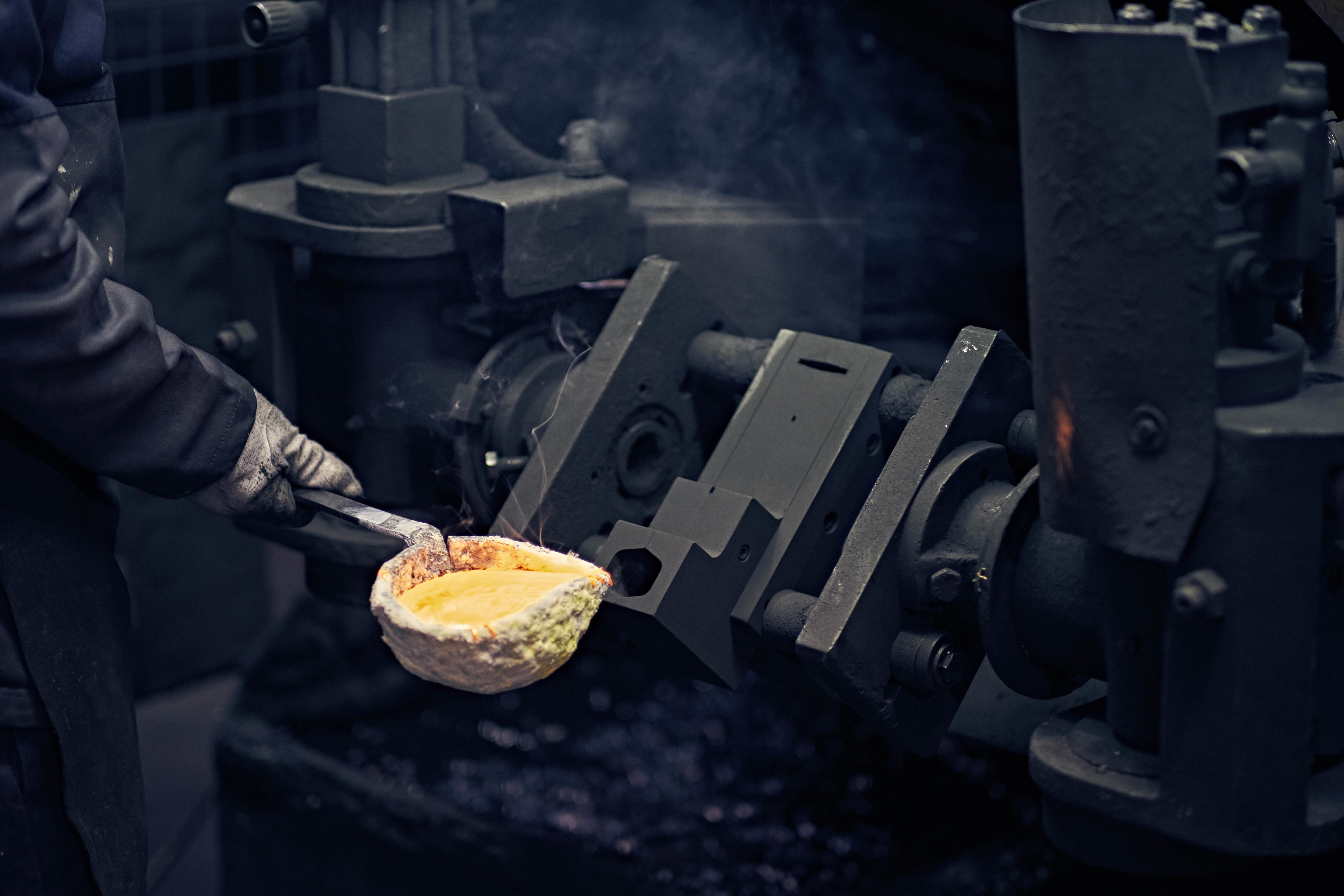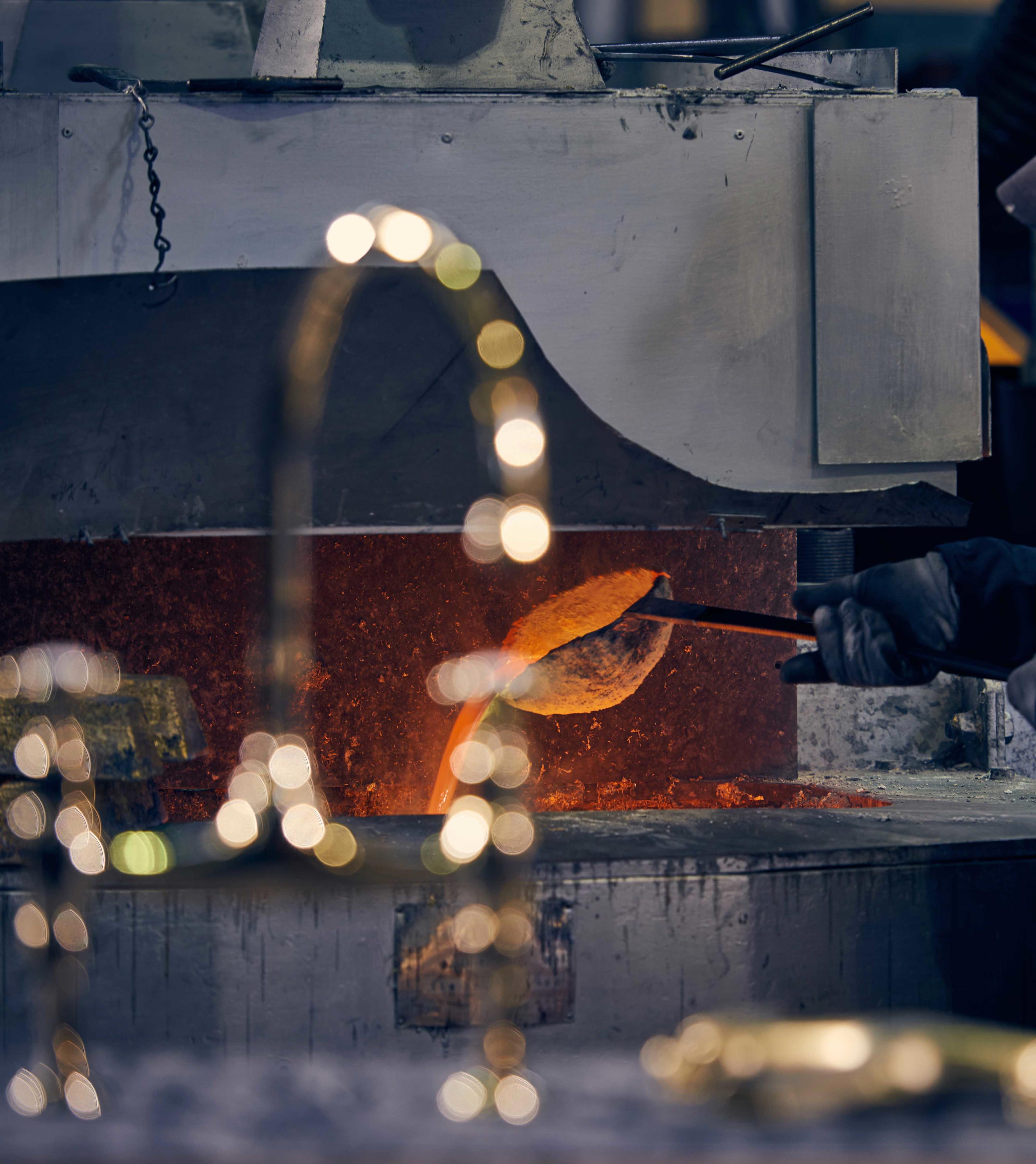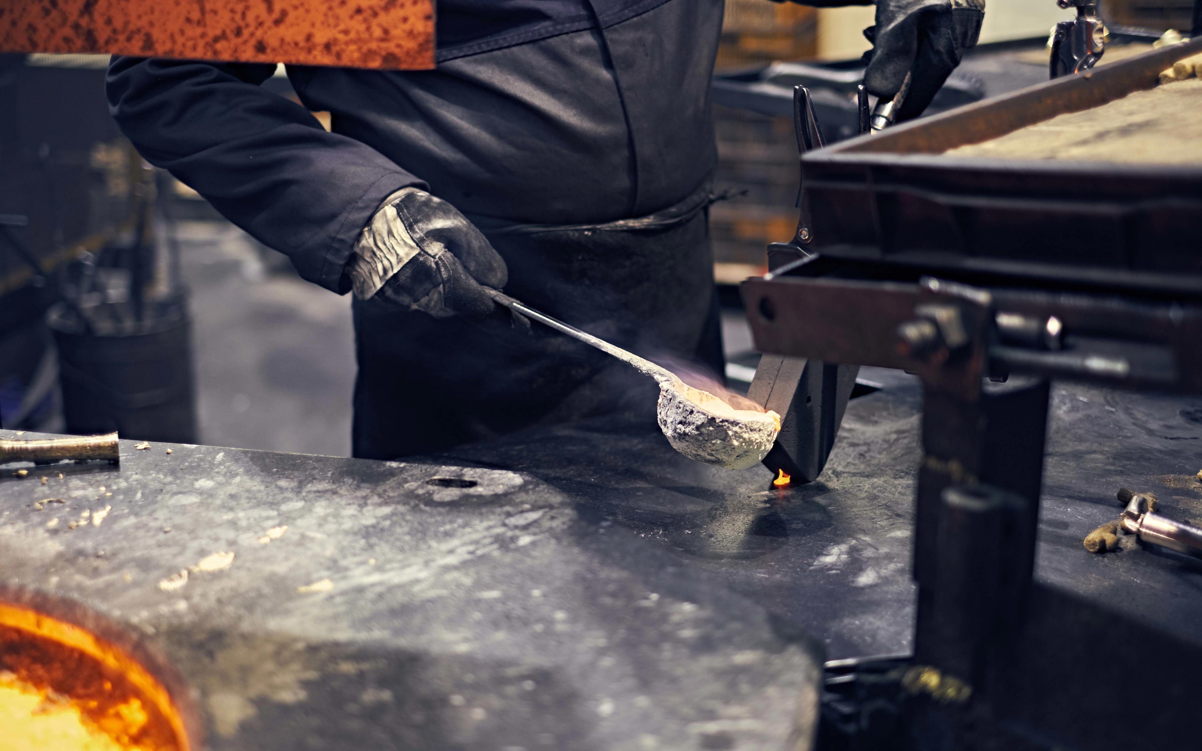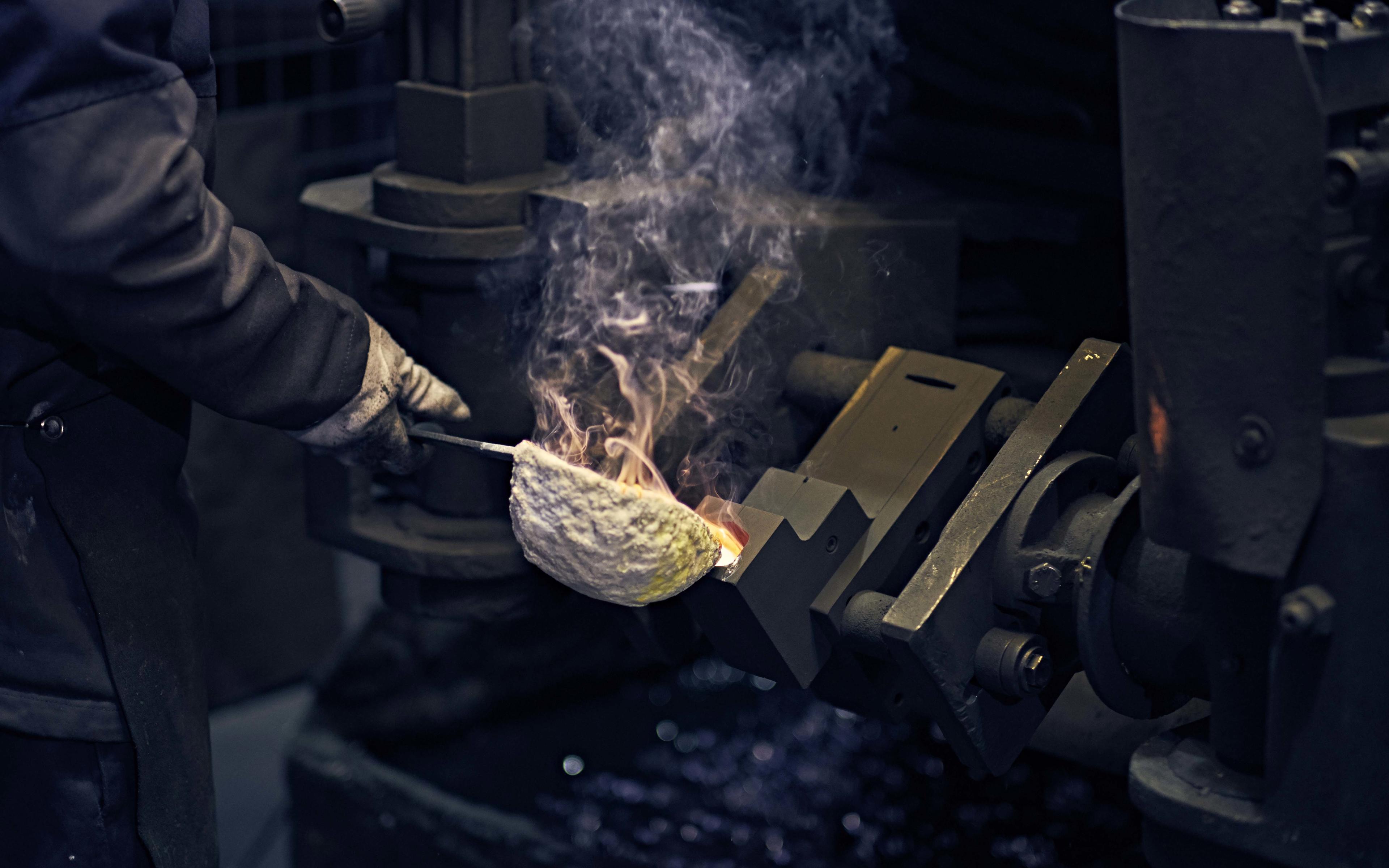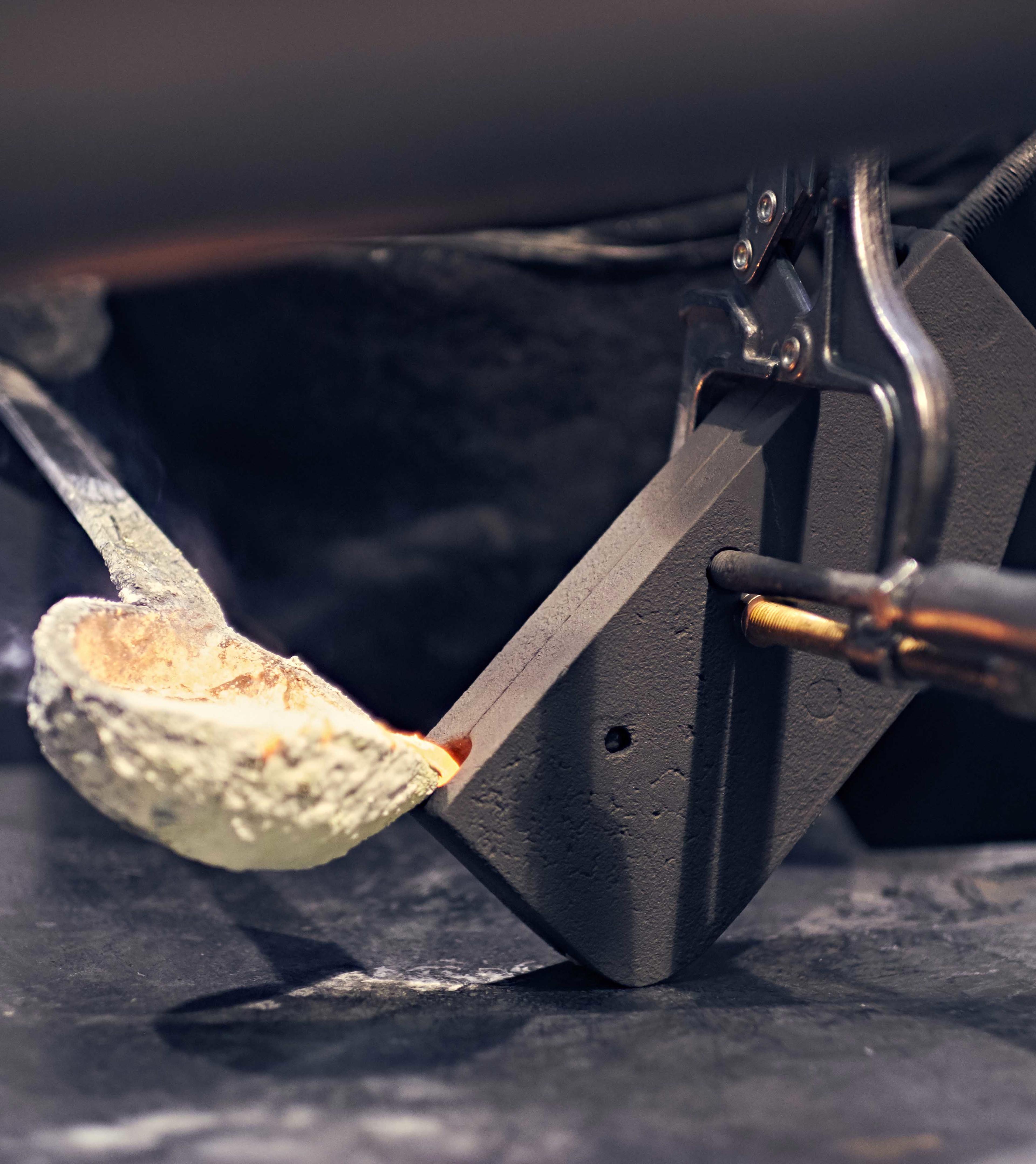 The brass we use is of the highest quality. Each ingot weighs 7 to 8 kilograms and is melted in a furnace at over 1700 °F. It takes skill, experience, and a measure of courage to ladle the molten brass into the cast iron dye.