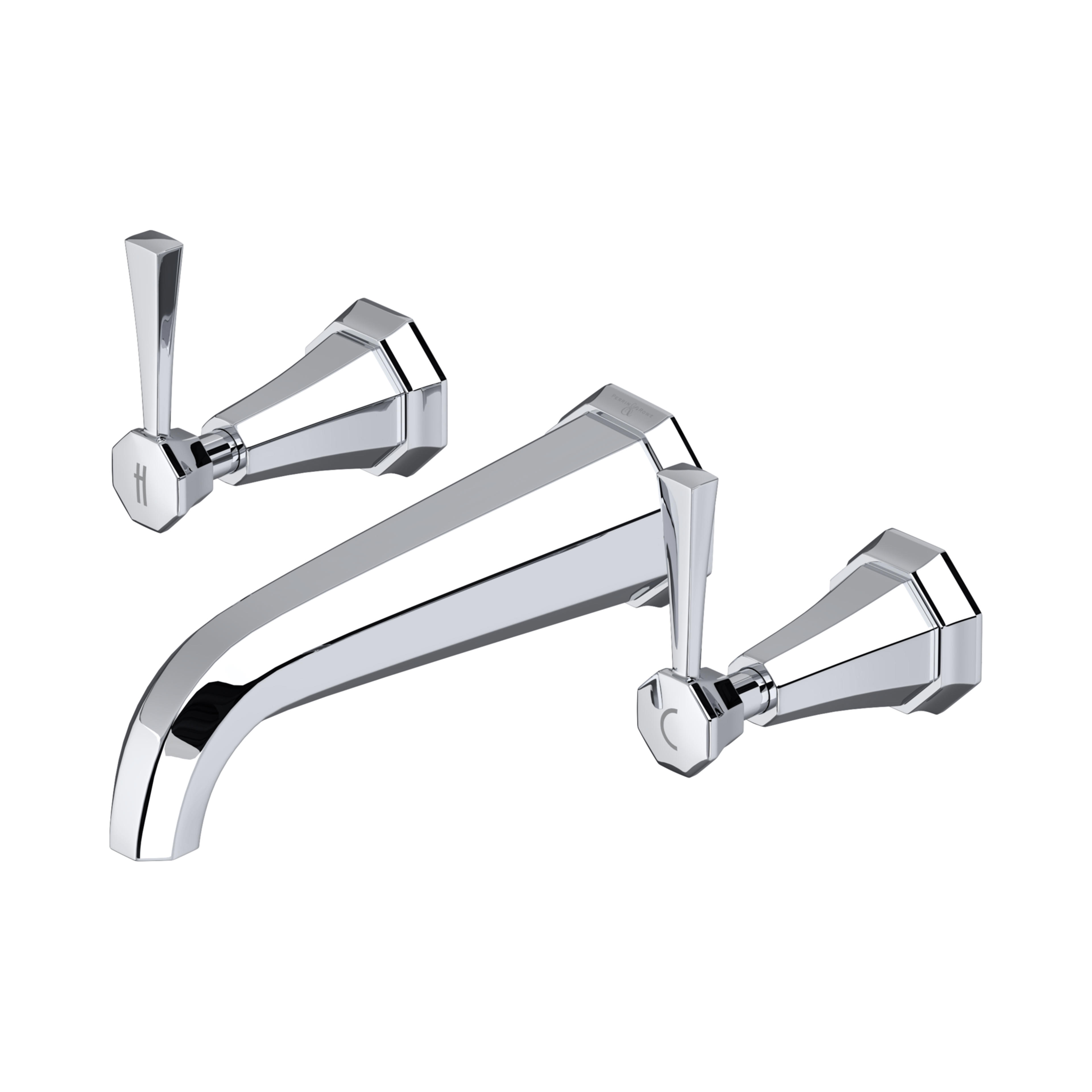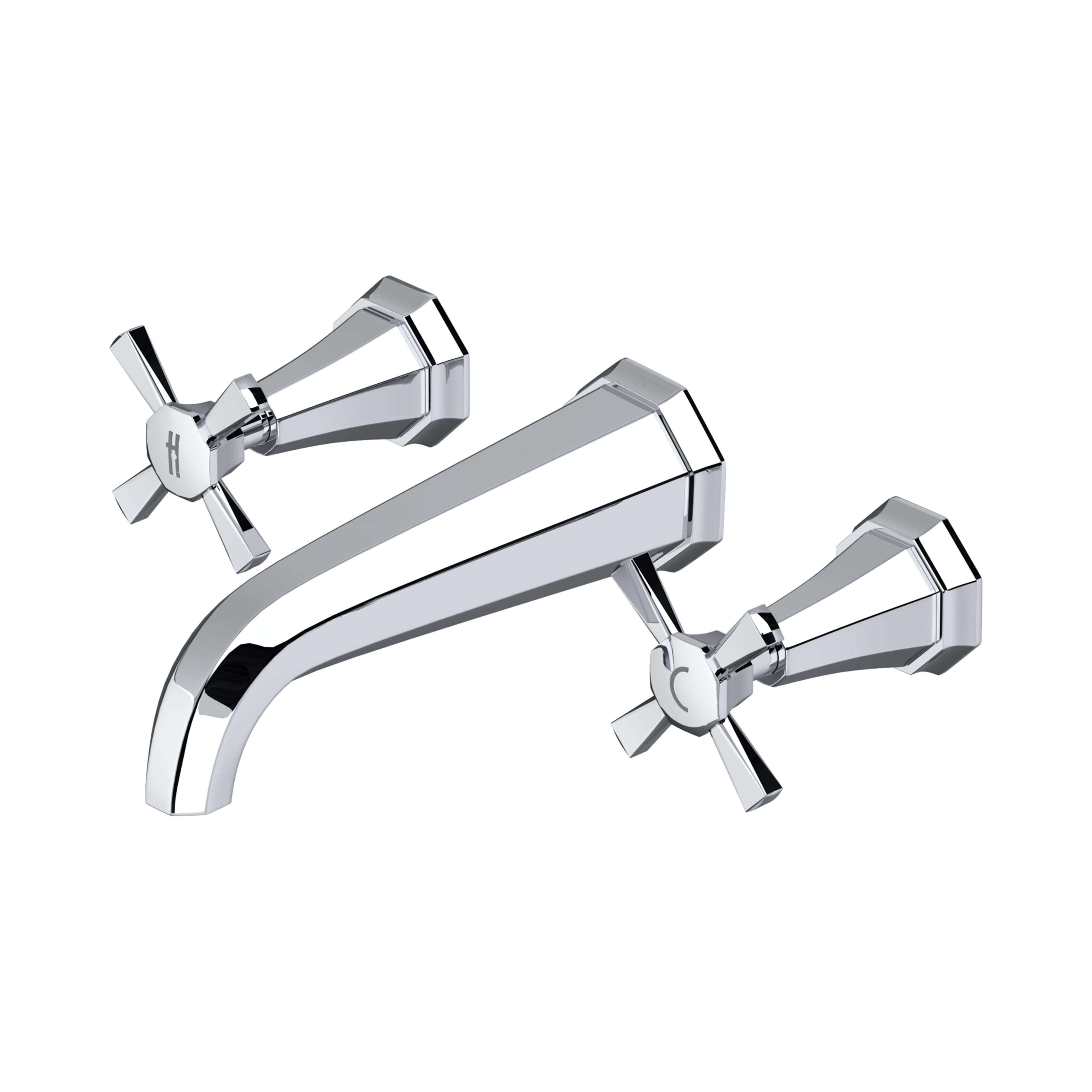 The Perrin & Rowe Deco collection draws inspiration from the Art Deco era of interior design. Opulent and distinctive with geometric patterns, it's a unique collection that can create a hotel-style bathroom in any space or home. This three-hole wall-mounted basin mixer with crosstop handles features the beautiful lines and shapes synonymous of the era, and is designed to be mounted on the wall above your basin or washstand. To complete the piece, the handles have been etched with 'H' and 'C' lettering.