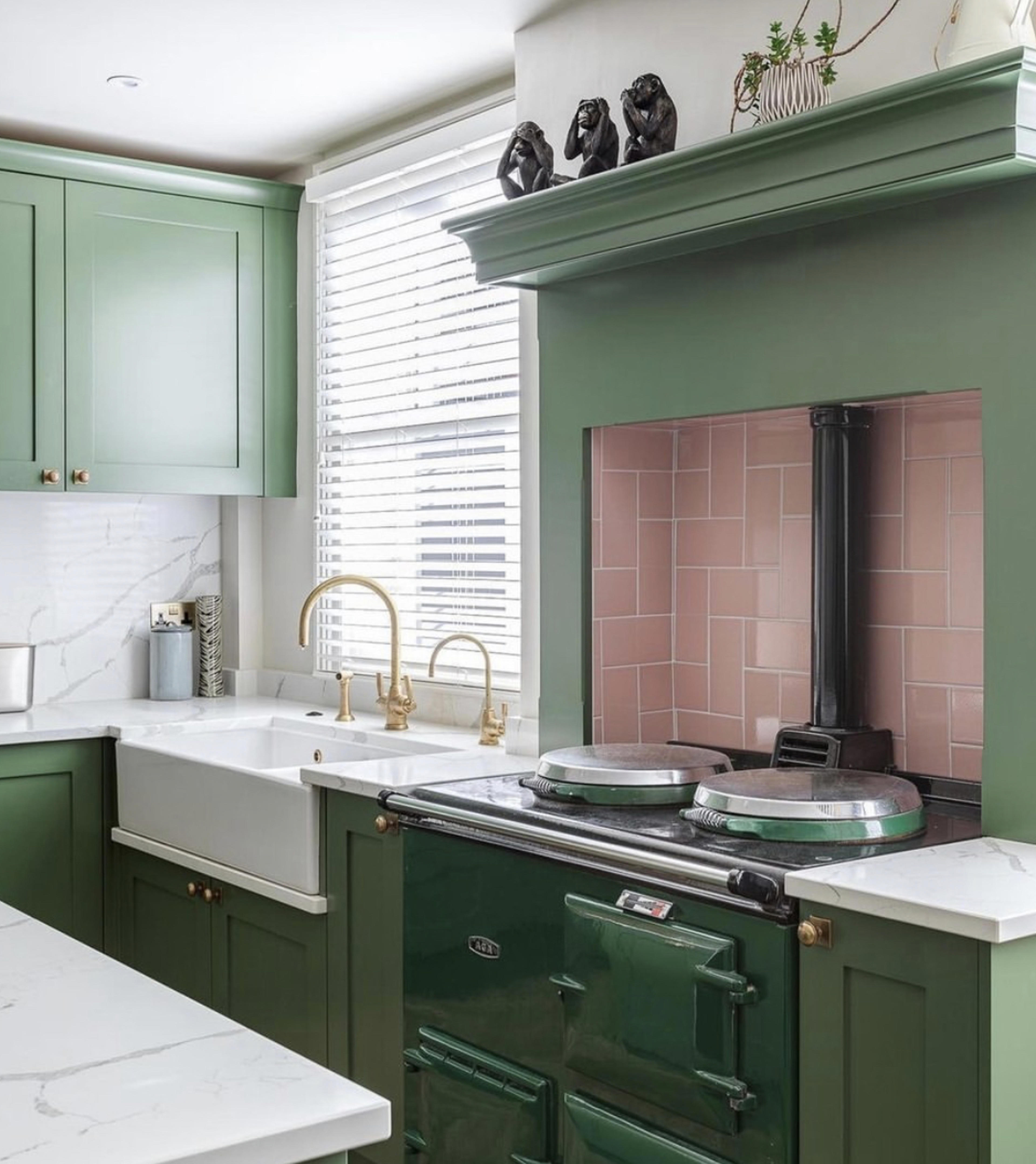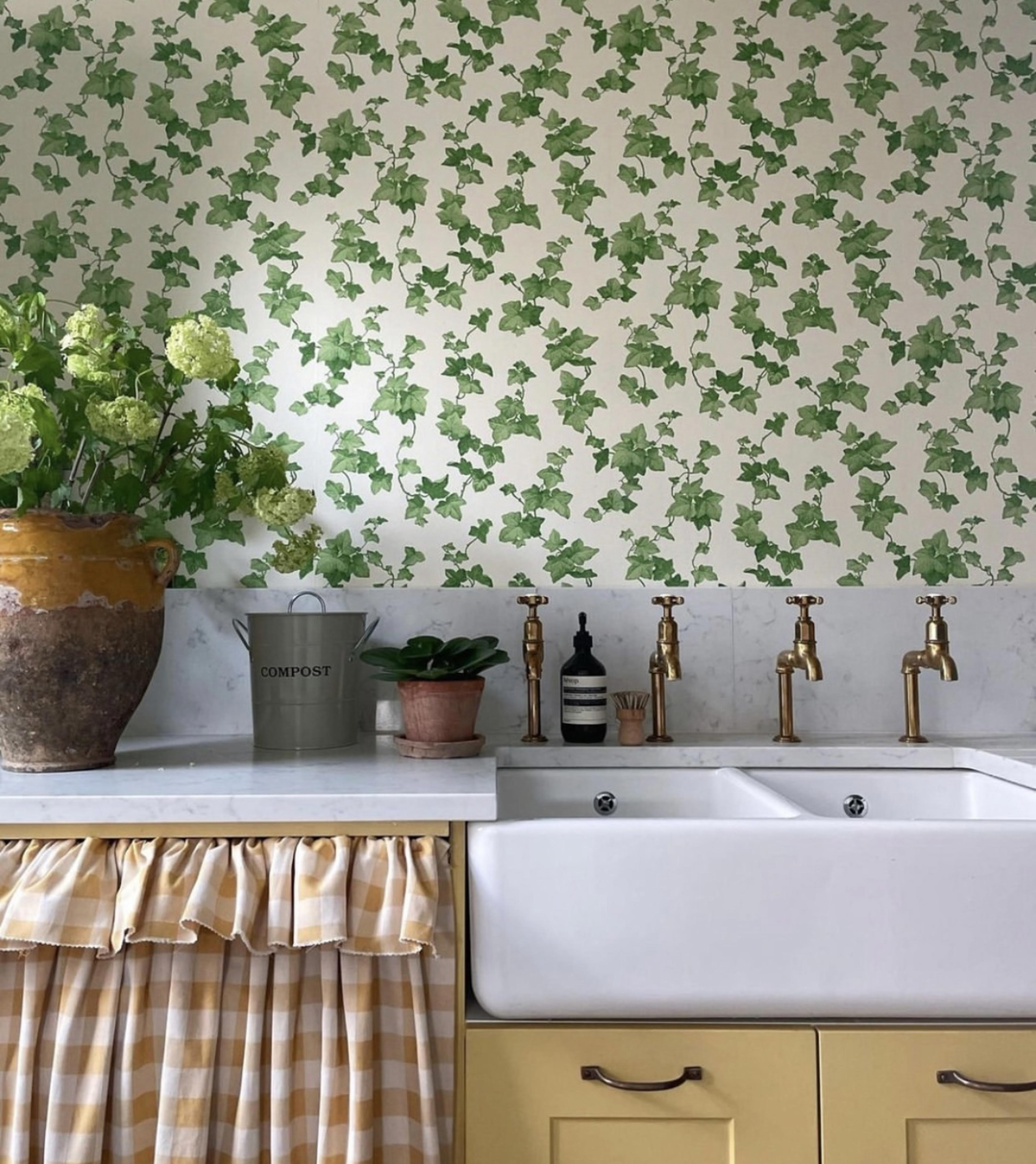 Kitchens and utility rooms are also perfect spaces for bringing a sense of the outside, in. Biophilic design has been a huge trend of late and it looks set to continue for 2023 and beyond. It’s all about harmonising modern architecture and the outside world; connecting our interior spaces to the natural resources outside. Your choice of wallpaper is a perfect way to achieve this look. In Megan of @kitandco_’s utility room a calming Sanderson Hedera Green wallpaper looks perfectly in keeping with four aged brass deVOL Mayan taps, which we make exclusively for the brand.