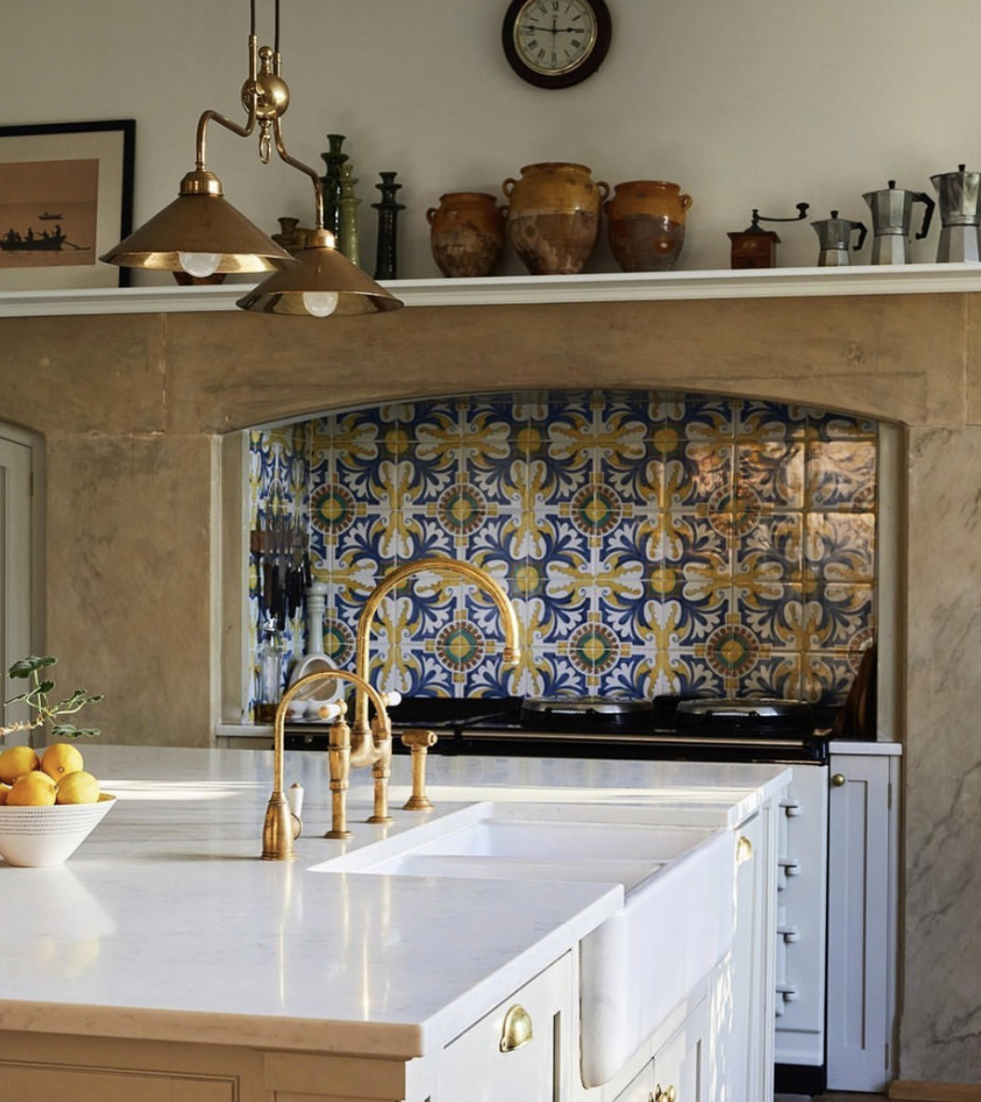 In Laura Butler-Madden’s butler’s pantry, Carnival wallpaper by Christopher Farr Cloth is fun and playful and looks stunning with our aged brass Athenian mixer and a Shaws of Darwen Bowland fireclay sink. The utility room is also designed in the same way featuring our aged brass Polaris 3-in-1 instant hot tap with rinse and a Shaws of Darwen fireclay sink.