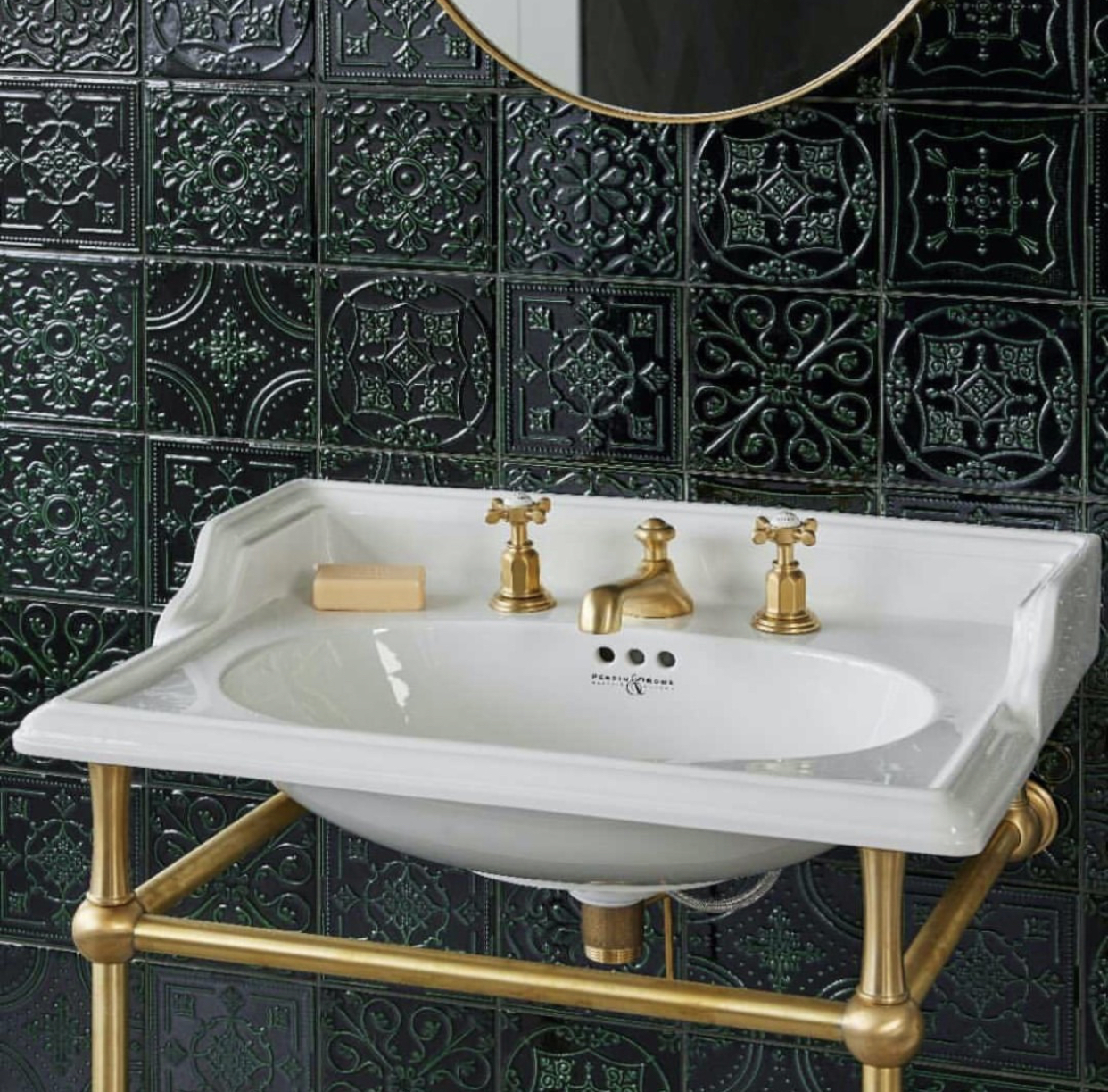 Check out this joyous Gucci Heron wallpaper for inspiration, which complements our polished brass traditional basin set from The English Tapware Company beautifully.