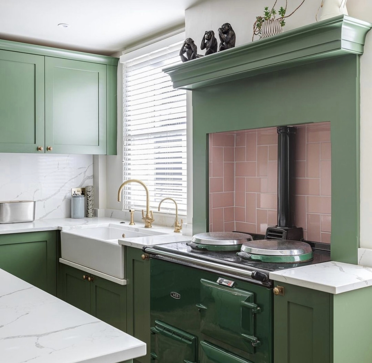 Kitchens and utility rooms are also perfect spaces for bringing a sense of the outside, in. Biophilic design has been a huge trend of late and it looks set to continue for 2023 and beyond. It’s all about harmonising modern architecture and the outside world; connecting our interior spaces to the natural resources outside. Your choice of wallpaper is a perfect way to achieve this look. In Megan of @kitandco_’s utility room a calming Sanderson Hedera Green wallpaper looks perfectly in keeping with four aged brass deVOL Mayan taps, which we make exclusively for the brand.