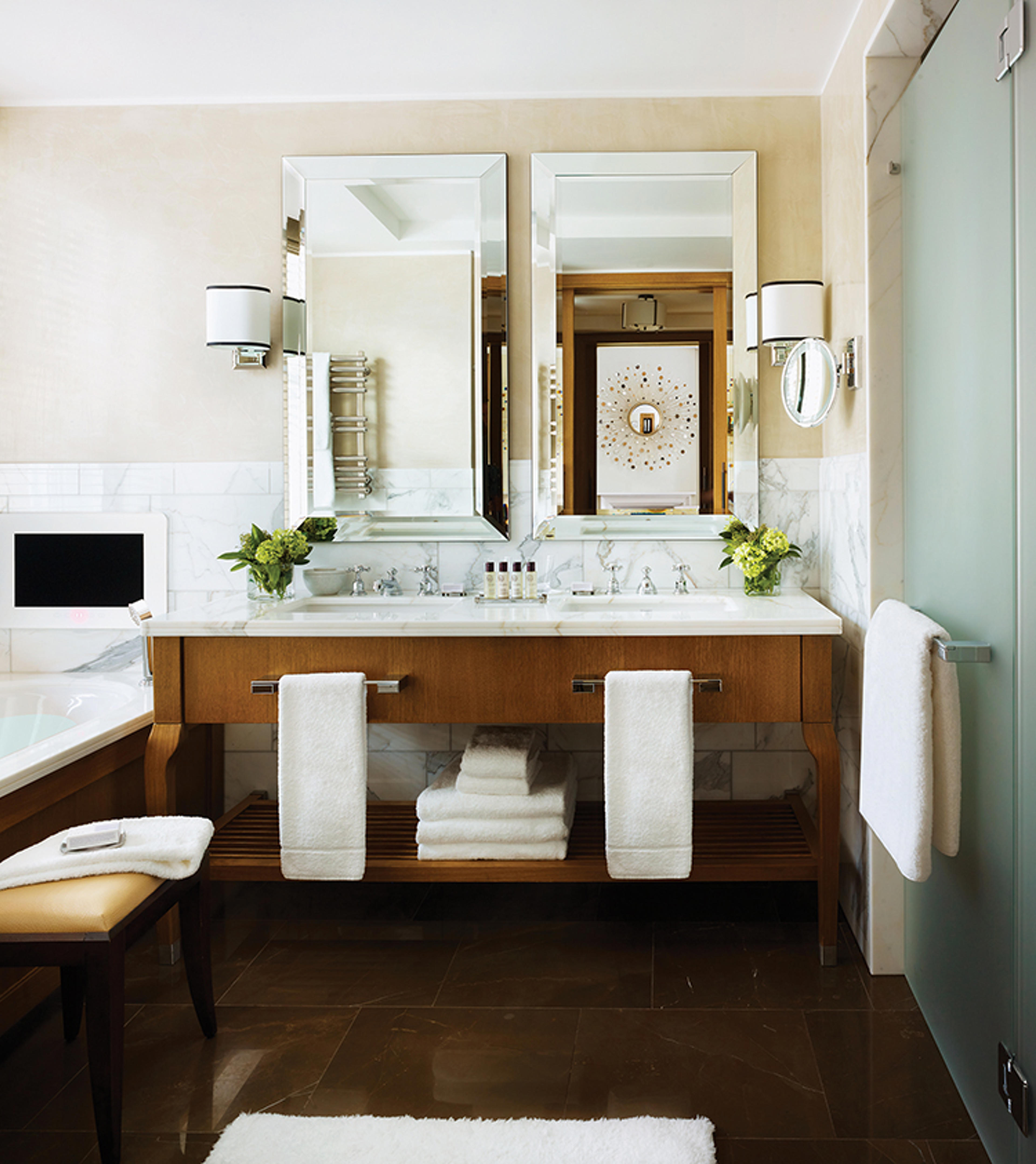 Designer Martin Goddard selected Perrin & Rowe as partner for all 294 guest rooms and suites. On major hotel and residential projects, our specialist team can work with a designer to develop unique products to suit a particular design style. In this case, a bespoke version of our Traditional brassware was produced complements the lavish Italian marble en-suites.