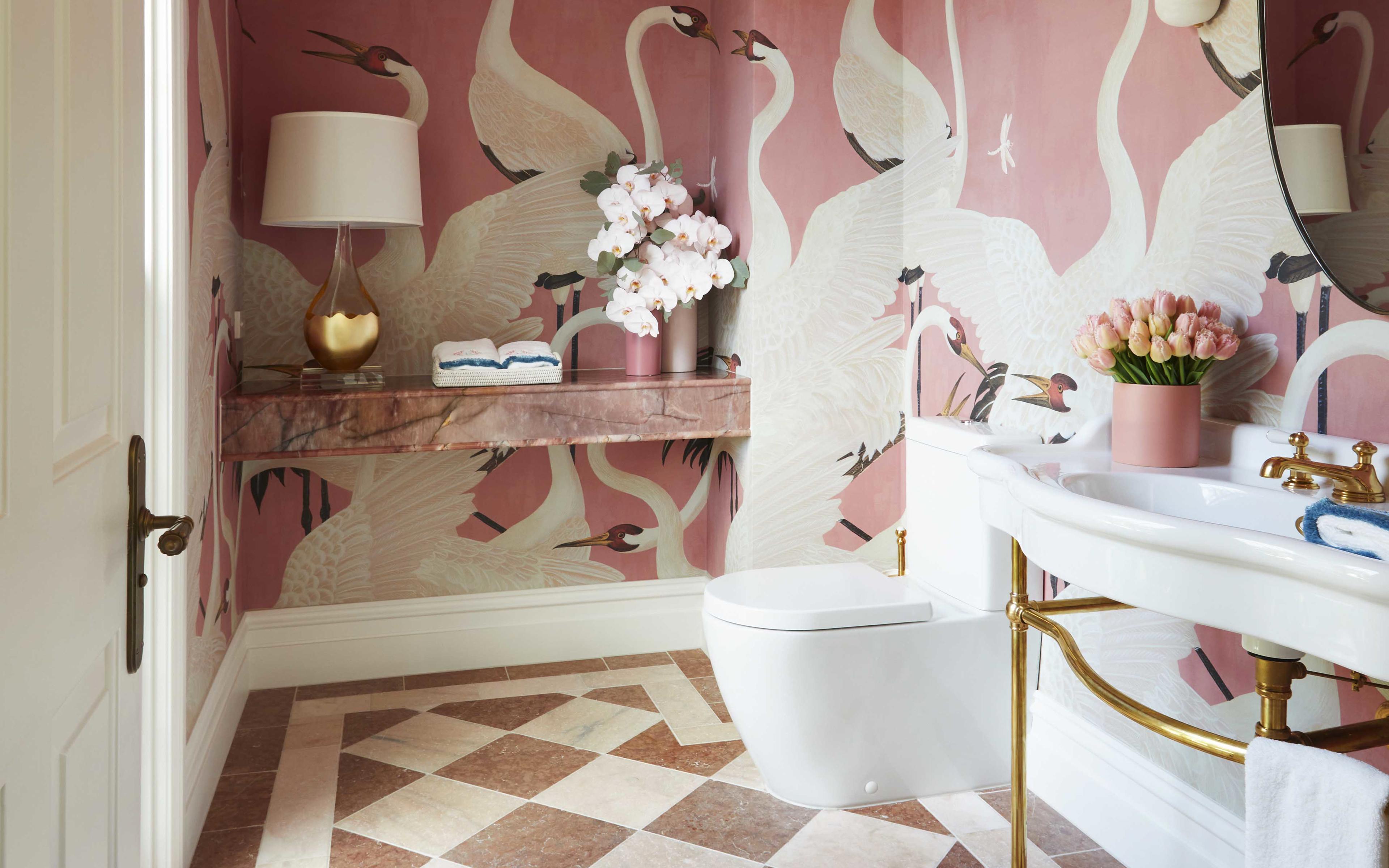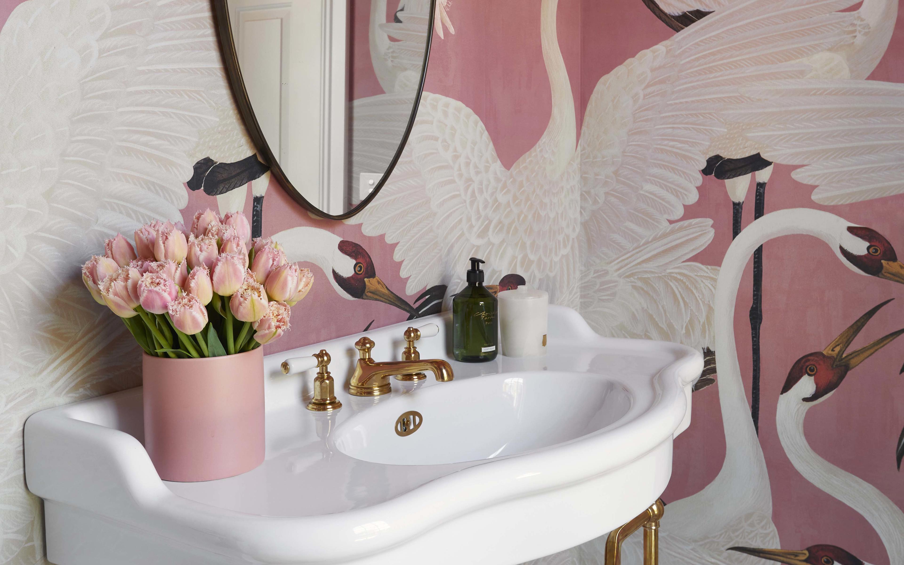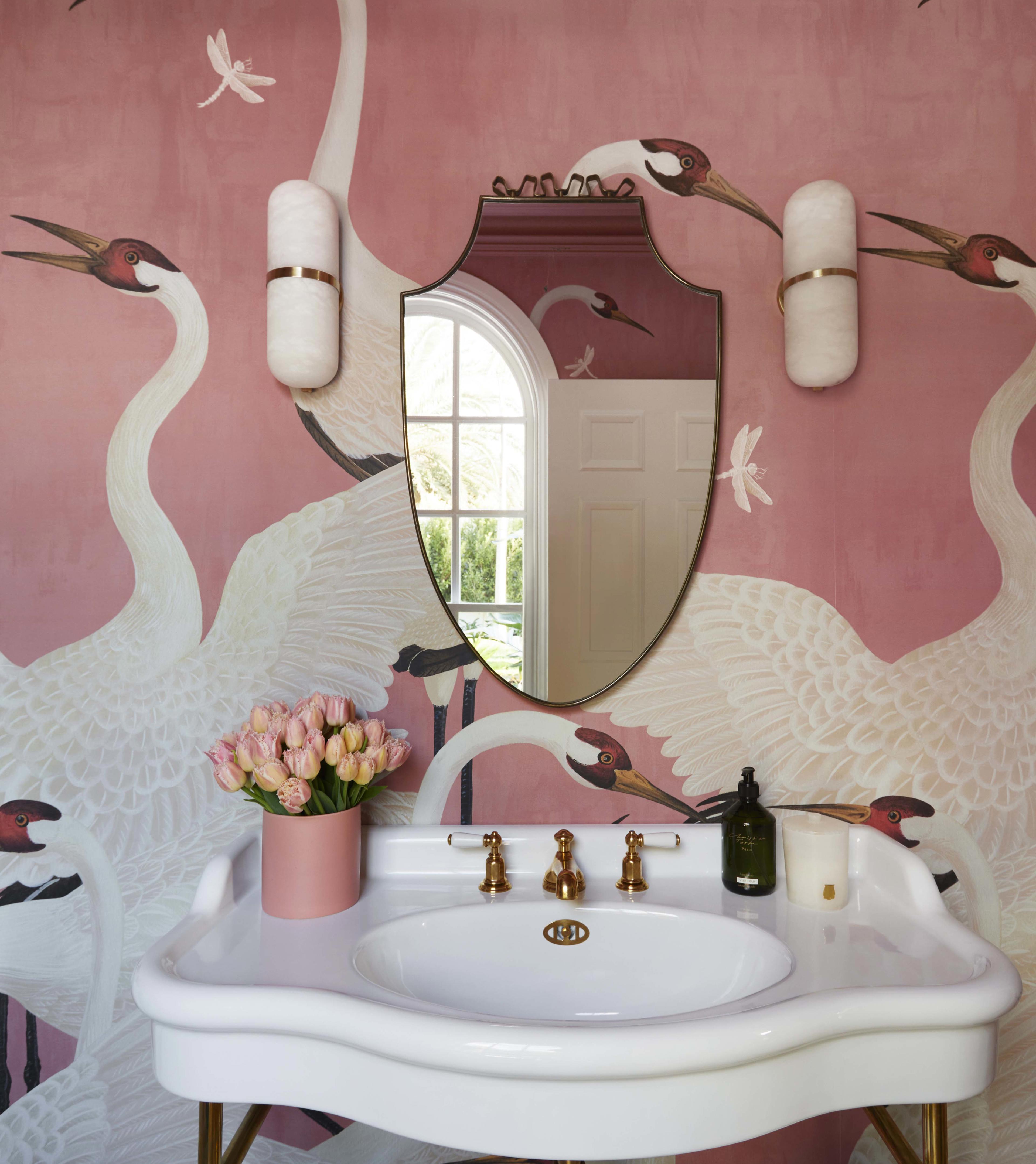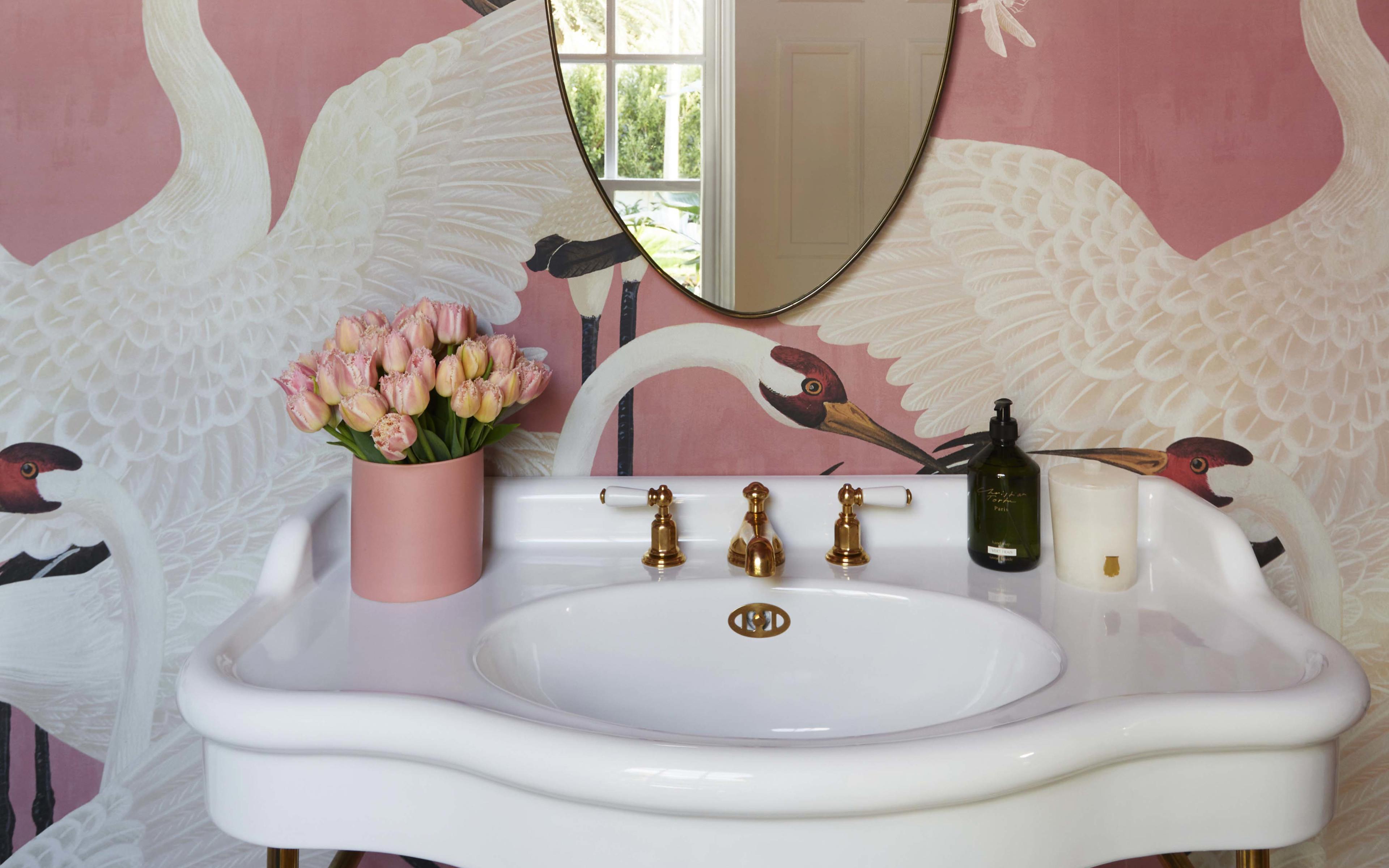 This powder room at Kate Watson’s Biscayne project is such fun and so very unique with Gucci Heron wallpaper. Brass and pink combine for a flamboyant, feminine space, that features pretty accessories from the Perrin & Rowe Traditional collection in a Polished Brass finish.