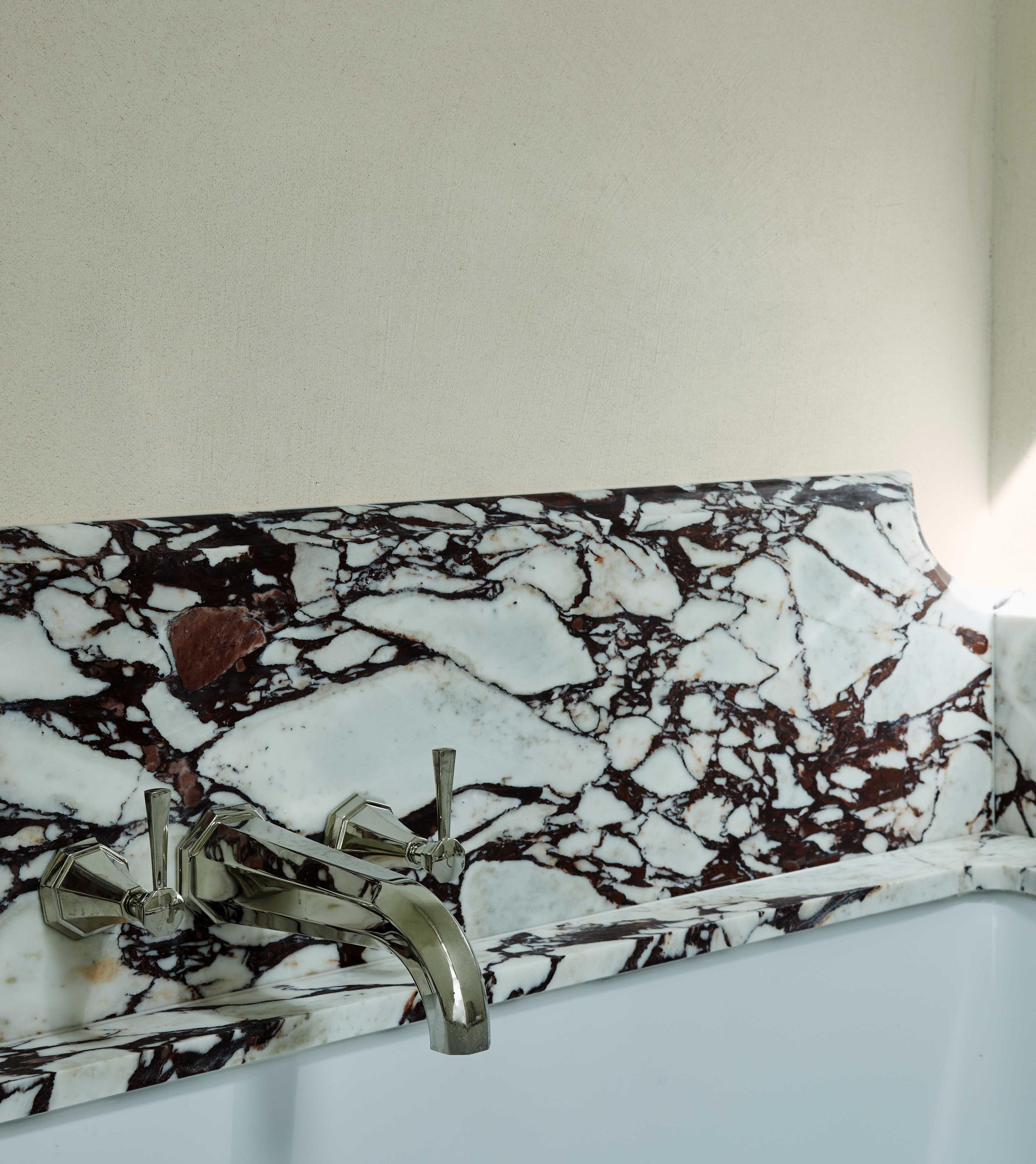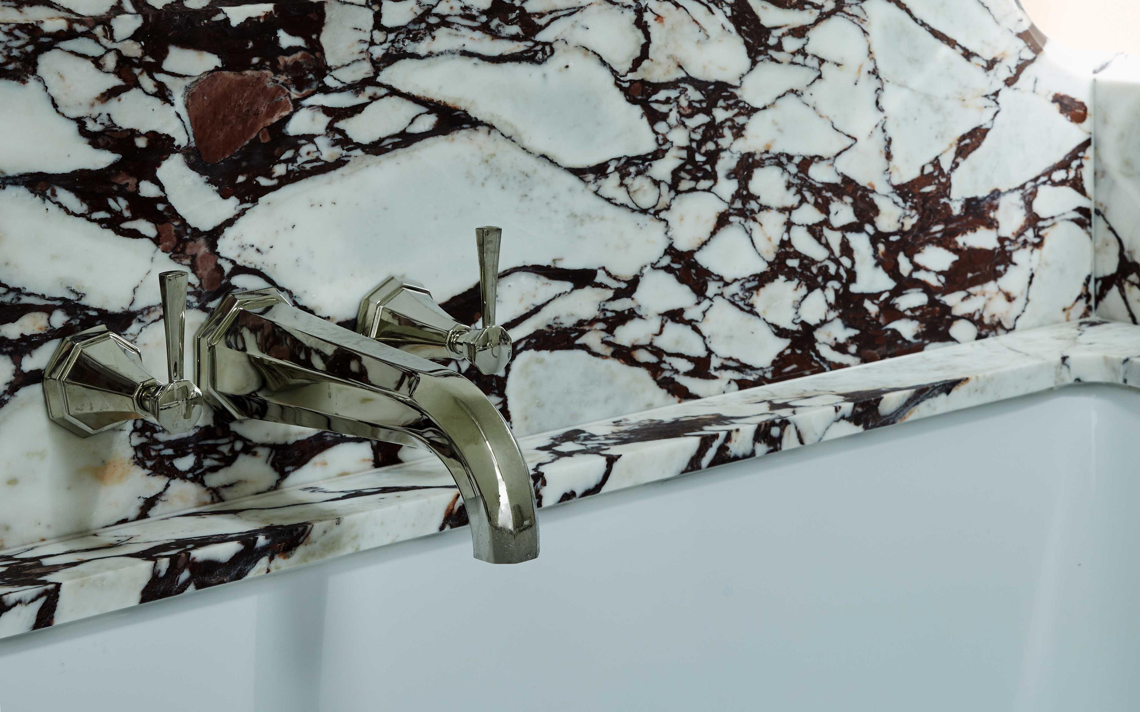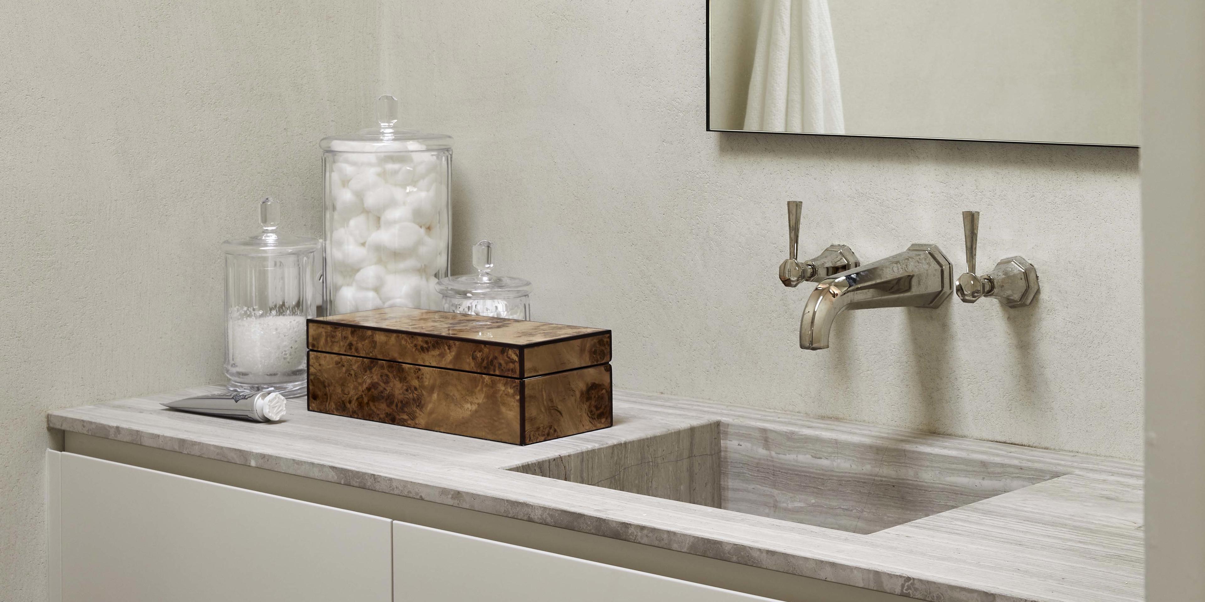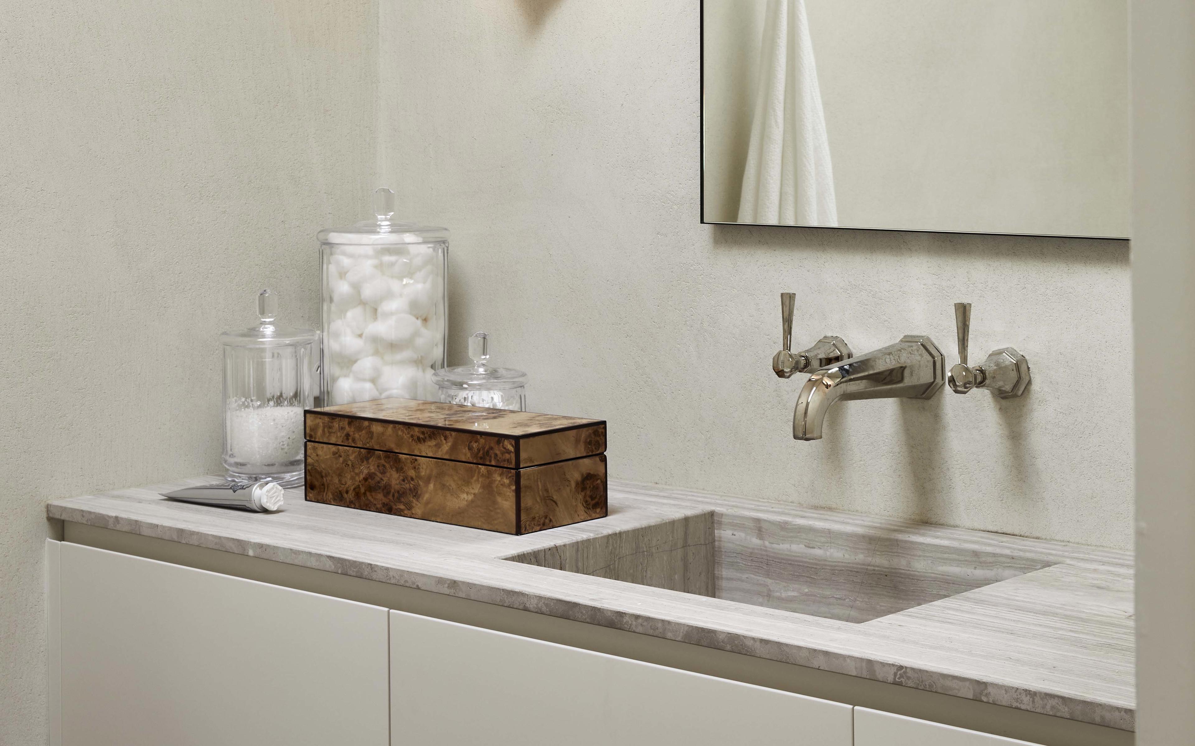 In the bathrooms, the Perrin & Rowe Deco collection has been specified in a Nickel finish; always a popular choice for those that want the sleek look and feel of Chrome but with a warmer aesthetic. The Deco bathroom collection is a beautiful blend of contemporary and traditional, influenced by the style of the Art Deco era. It looks particularly striking when teamed with veined marble as the designer has done in this home.