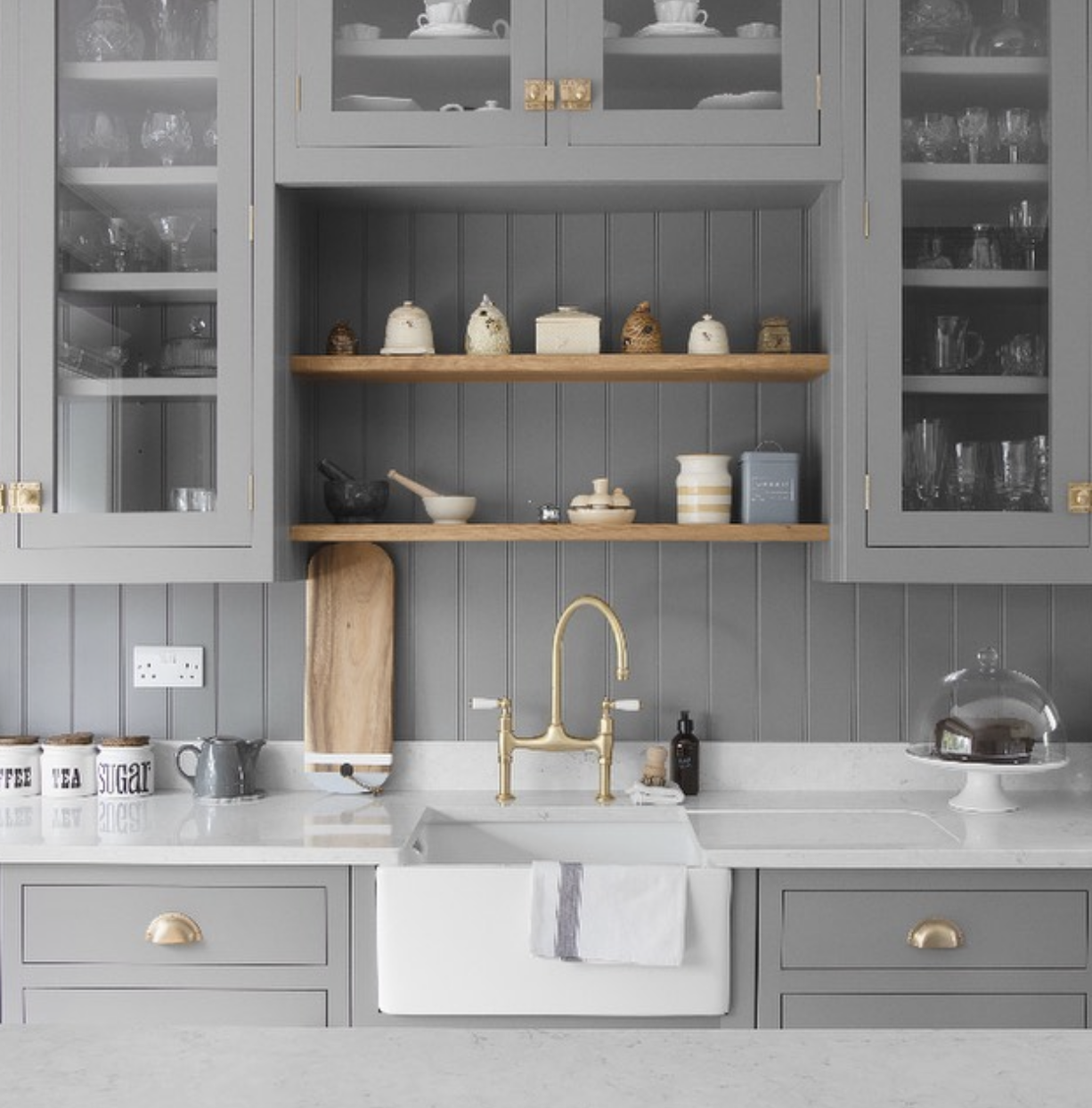 This bespoke, hand-painted kitchen by Lund & Law features plenty of storage and our Ionian mixer in satin brass with porcelain lever handles.
