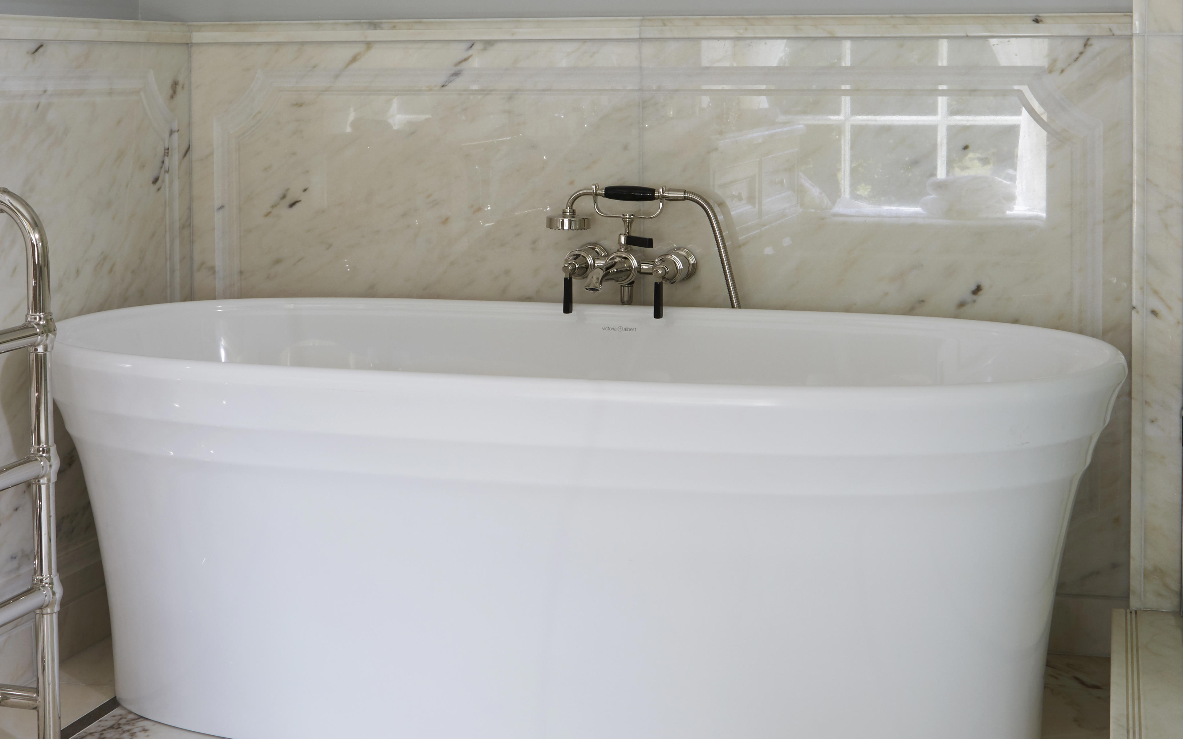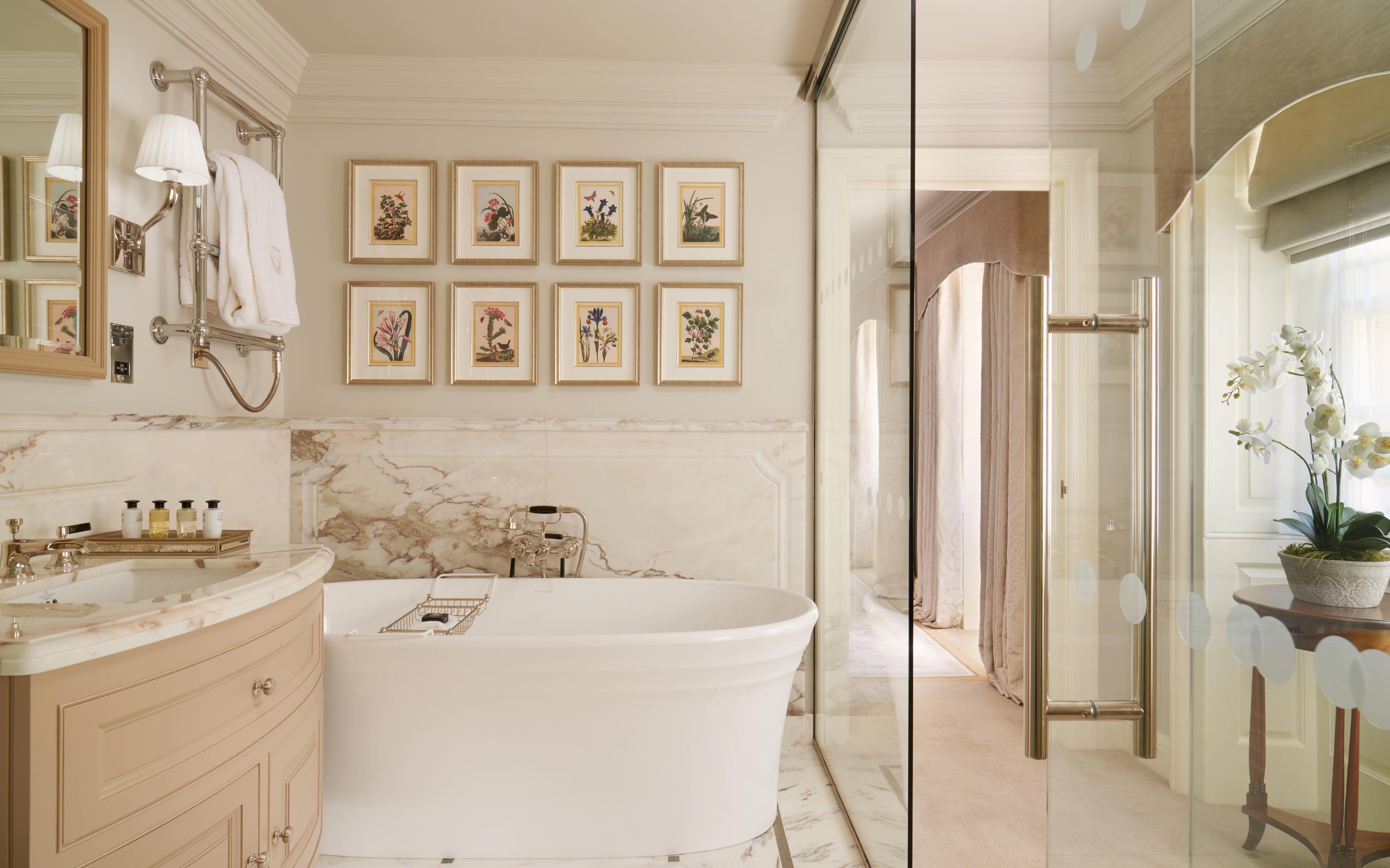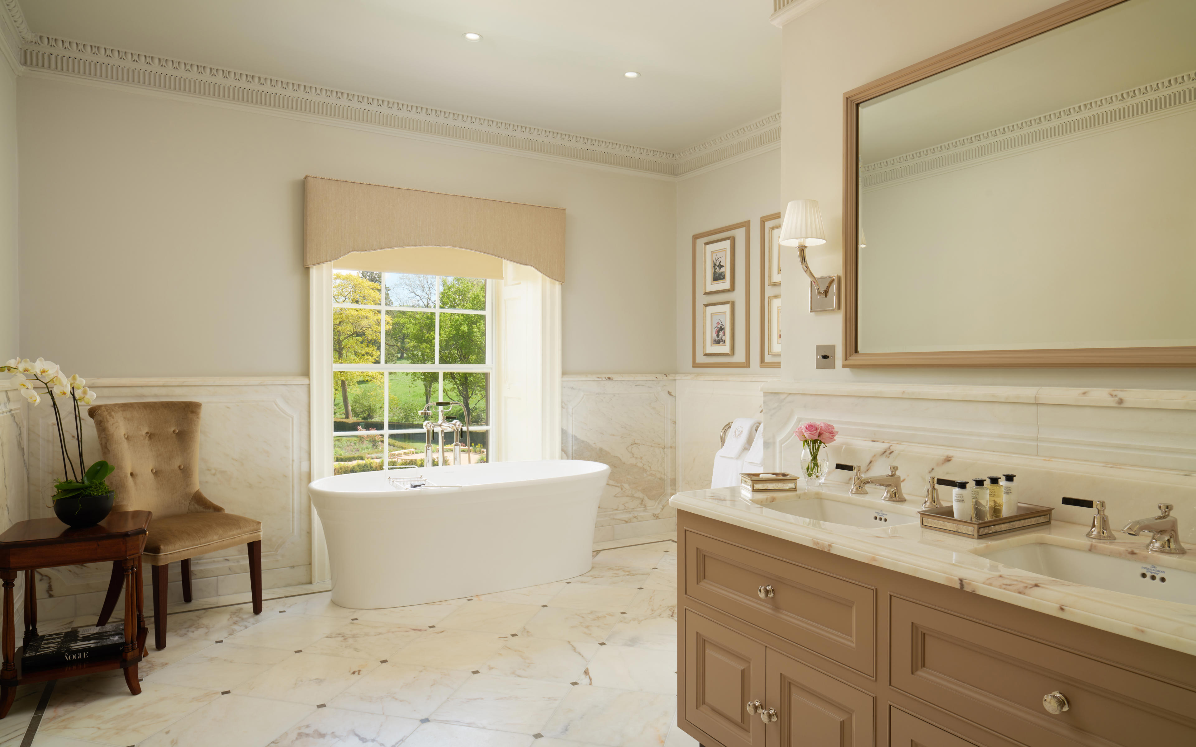 Bedrooms are decorated in elegant muted tones; soft shades of cream, gold and grey; button-back velvet armchairs; marble-topped bespoke furniture; and upholstered bedheads. There are shelves of modern hardbacks, televisions hidden behind paintings, decanters of damson gin, touch-button lighting, and even a bathrobe menu. Bathrooms are marble-clad, with freestanding bathtubs and vast walk-in showers