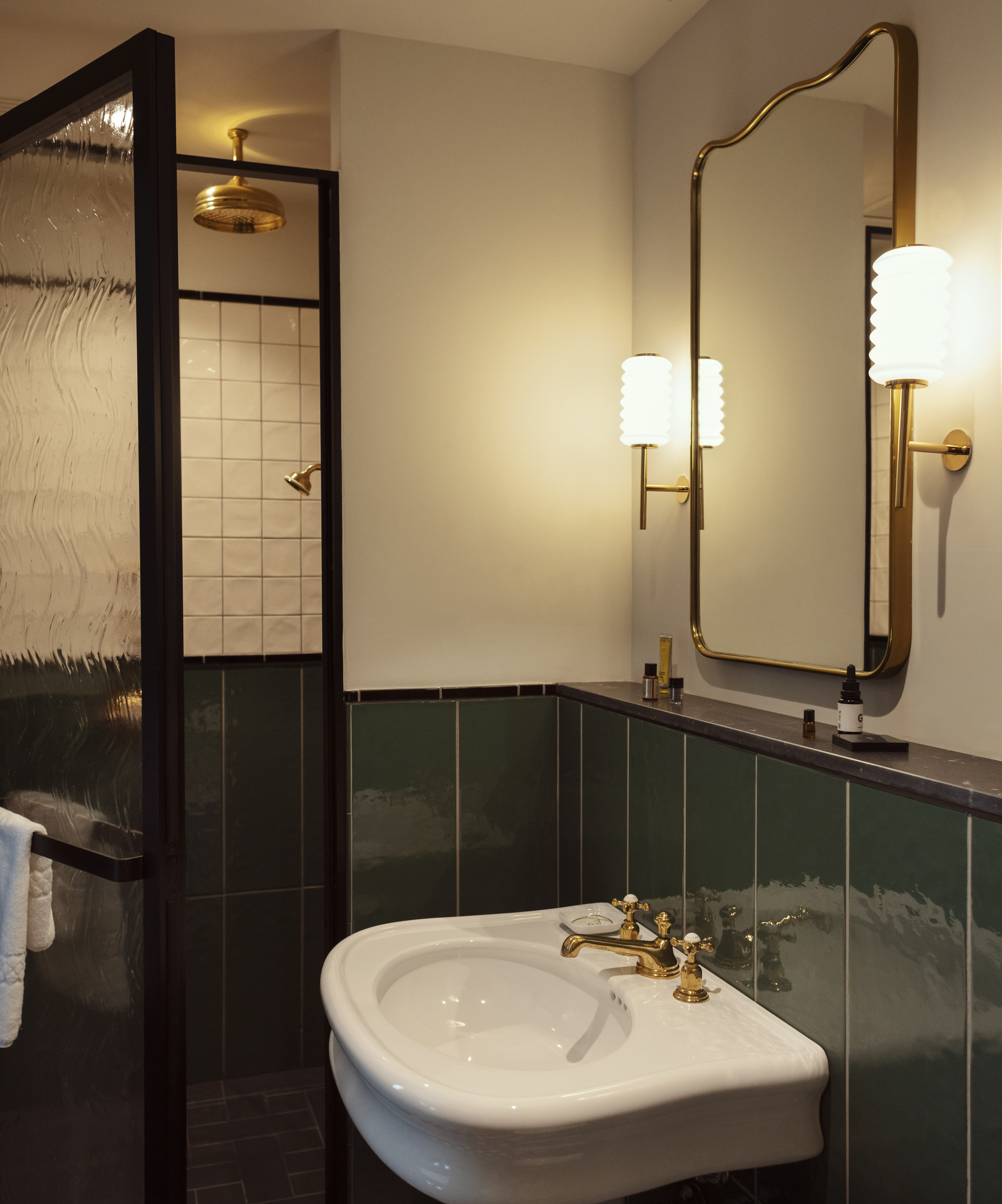 Bathrooms are inspired by the nostalgic interiors of classic Italian cinema, with plush fixtures and fittings including polished brass taps and accessories from Perrin & Rowe’s Traditional bathroom range for a touch of glamour. Luxury hotel bathroom design at its very finest.