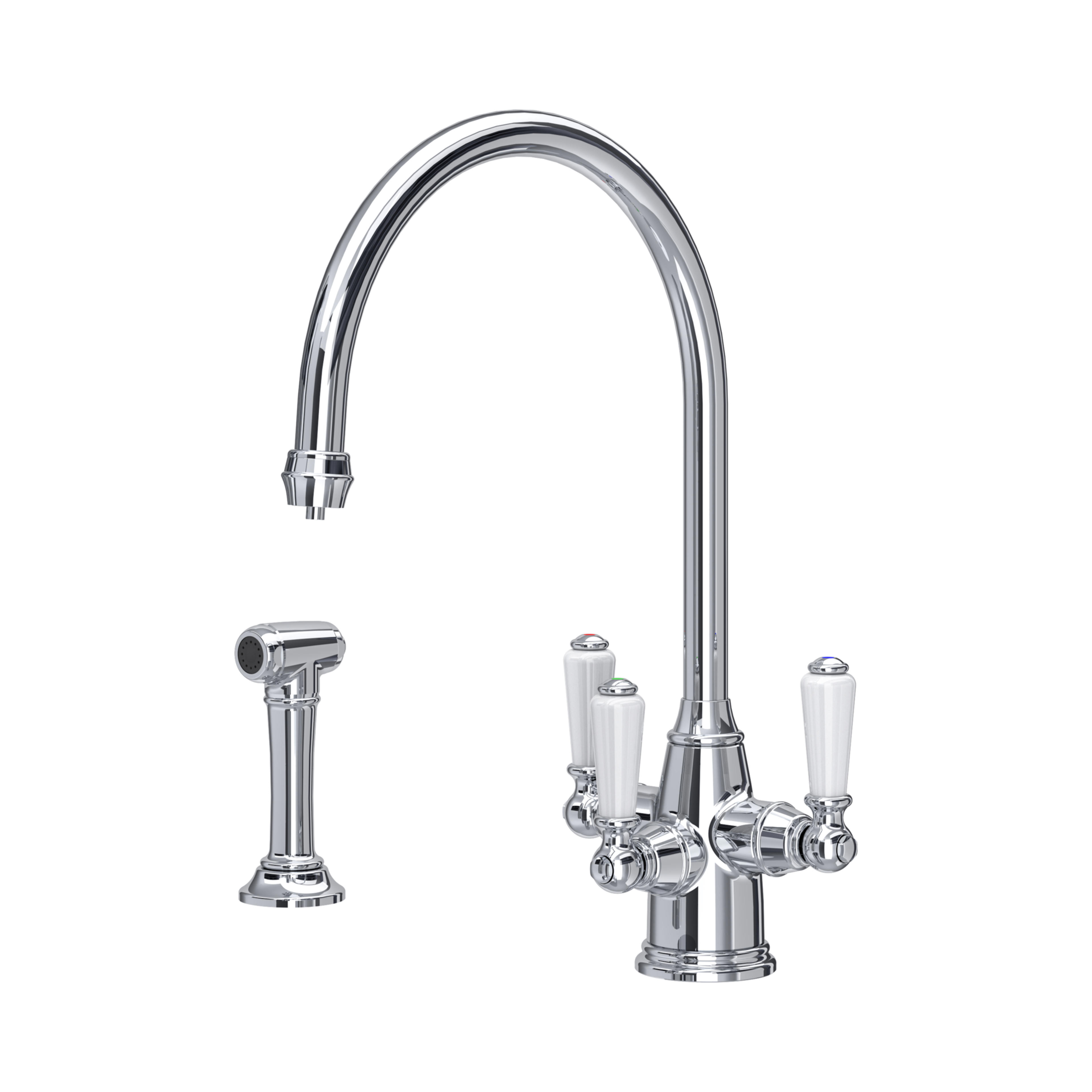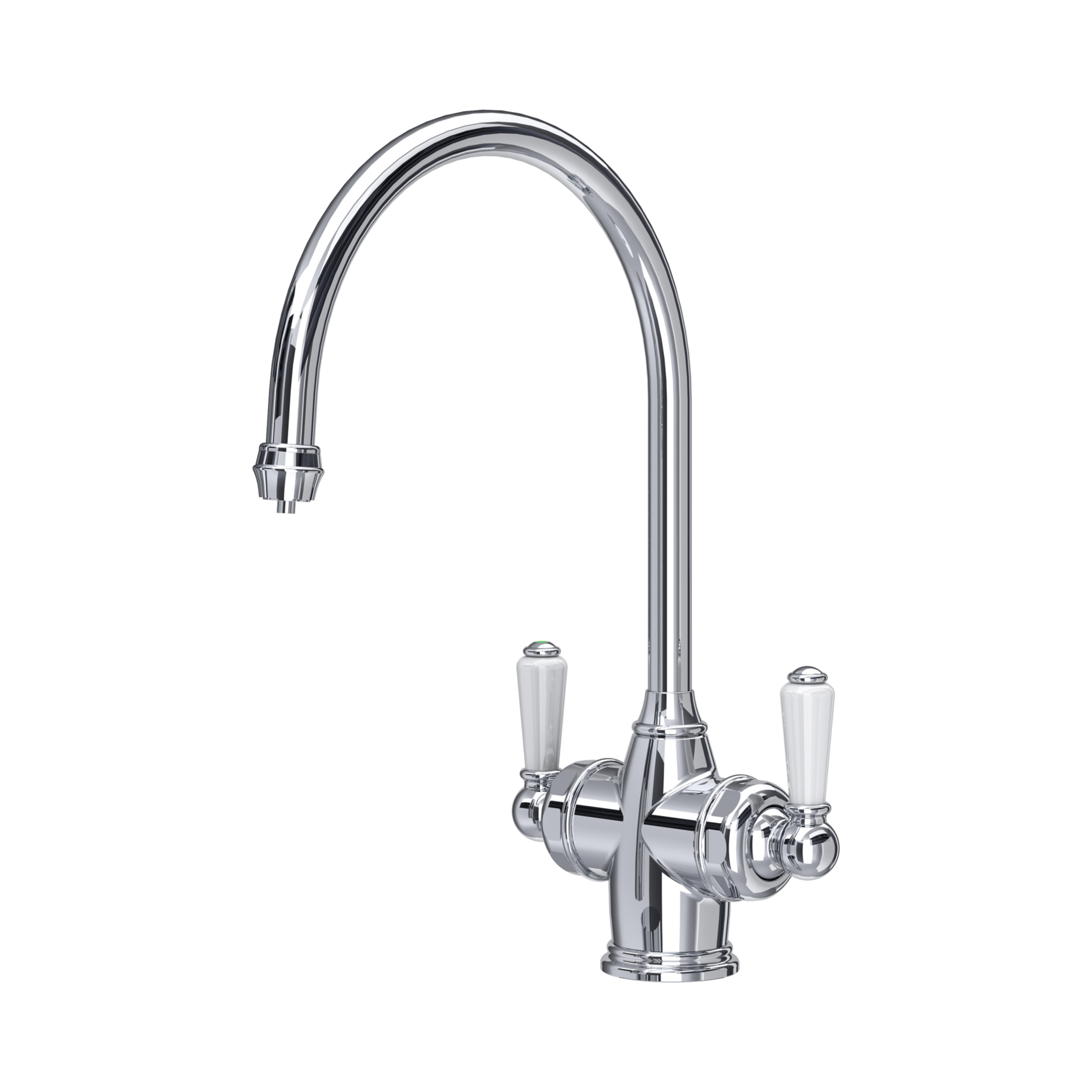 The classic bridge mixer and an iconic Perrin & Rowe tap, the Ionian deck-mounted bridge mixer is very much at home in both traditional and contemporary kitchens. This version features beautiful porcelain inserts on the lever handles, and looks beautiful in all eight of Perrin & Rowe's beautiful finishes.