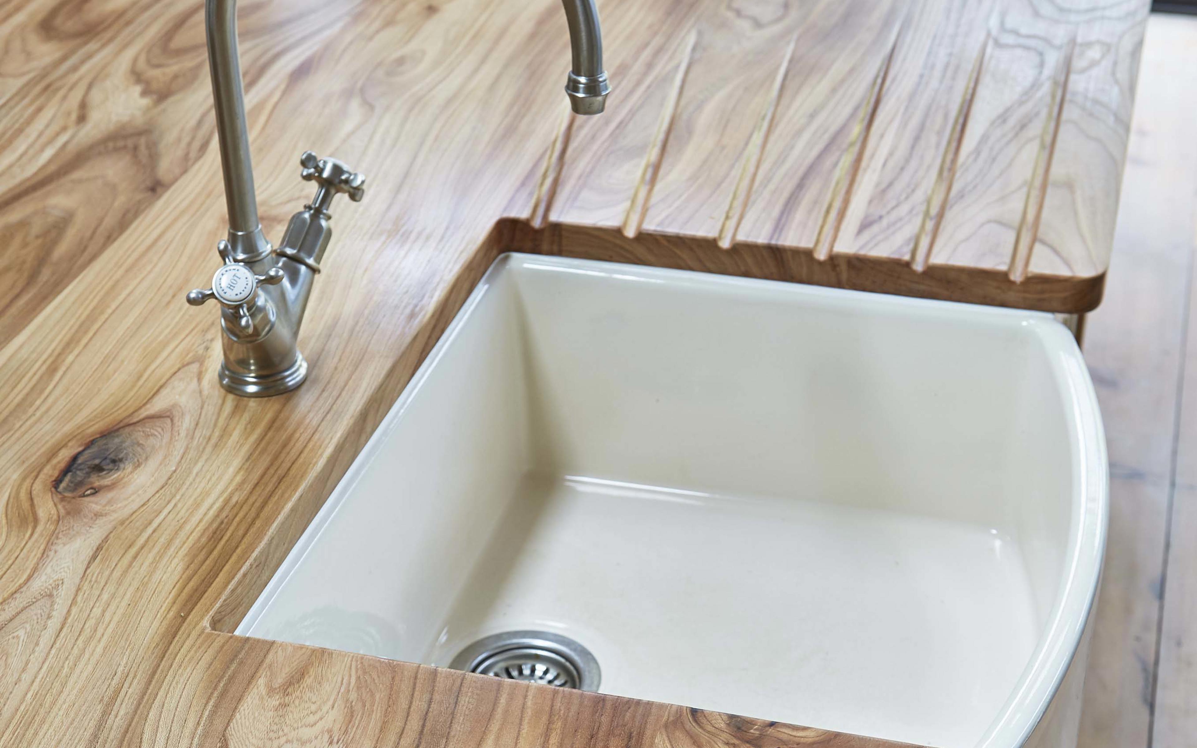 The owners wanted to retain the existing sink – an elegant bow-fronted Waterside 600, which they had become very fond of over the years. Shaws sinks are handmade using heavy duty fireclay, and are incredibly durable. The Waterside 600 sink was refurbished to remove any patina earned by its many years of hard work.